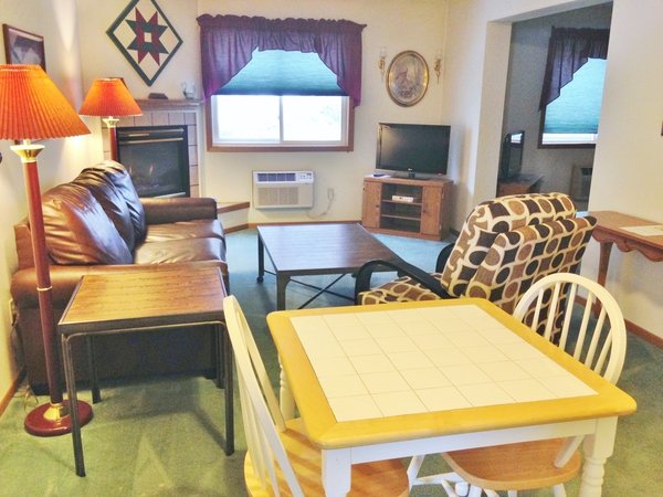 Suite with one queen bed, whirlpool, fireplace, pull out queen sofa bed, microwave and fridge.